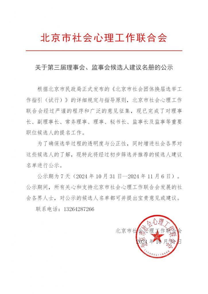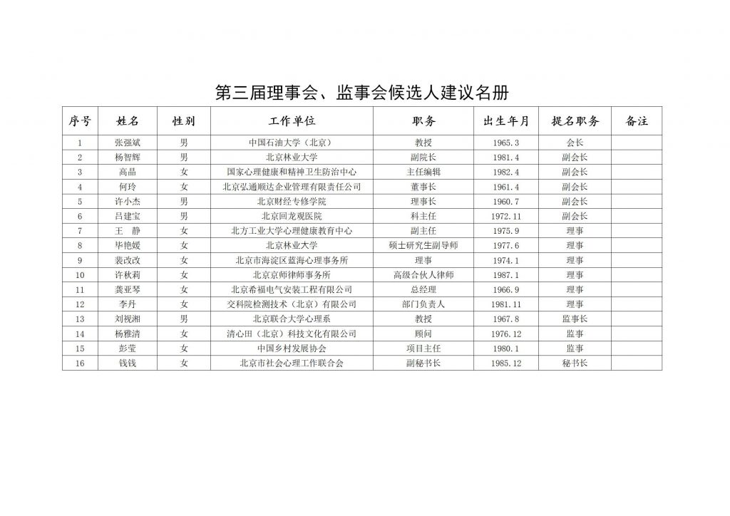 关于第三届理事会、监事会候选人建议名册的公示 – 北京市社会心理工作联合会-欧亿平台在线登录注册
